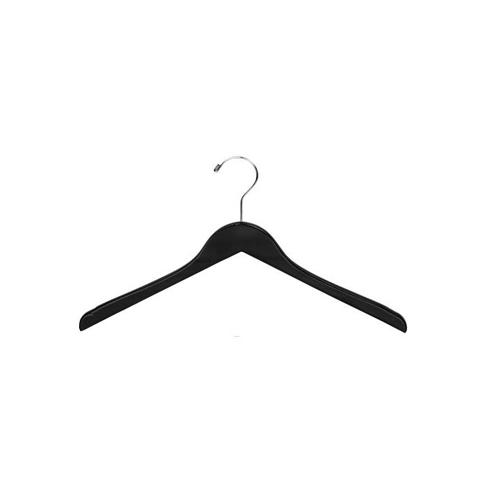 Black Wood Shirt Hangers offer a simple and elegant look to your merchandising. Flat hanger with chrome hook, 17". Sold individually with quantity pricing available when purchasing 50 or more.