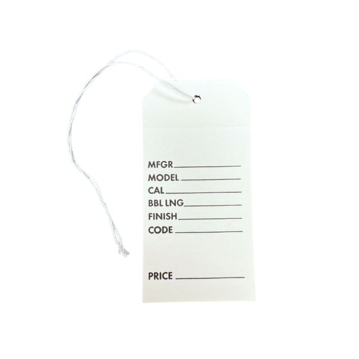 Specialty Firearm Tags are 3 3/4"H x 1 7/8"W. White cotton string. Sold in packs of 100.
