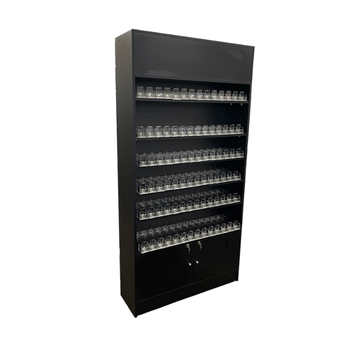 Premium Cigarette Display Wall Case. Complete with 84 Cigarette Pushers that easily connect to fill 14 per shelf. 5 adjustable shelves and storage base. Storage base is 18" x 12" x 14" with hinged doors with locks and knobs. This black melamine finish wall case is the perfect display for your retail space. Keeping your merchandise clean and organized.